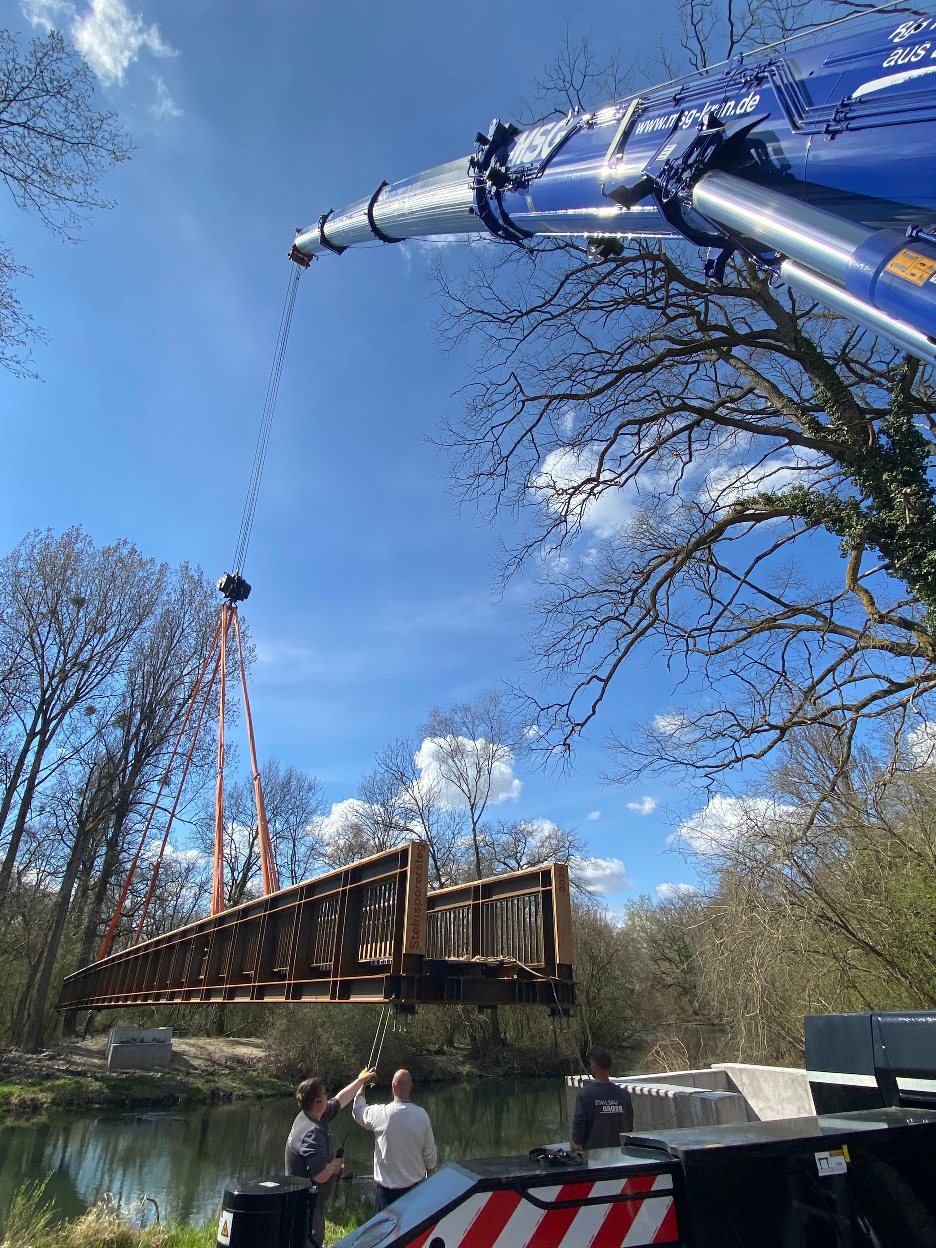 Am Montagvormittag wurde die neue Steinsporerbrücke mittels eines großen Krans an der entsprechenden Stelle im Taubergießen eingesetzt